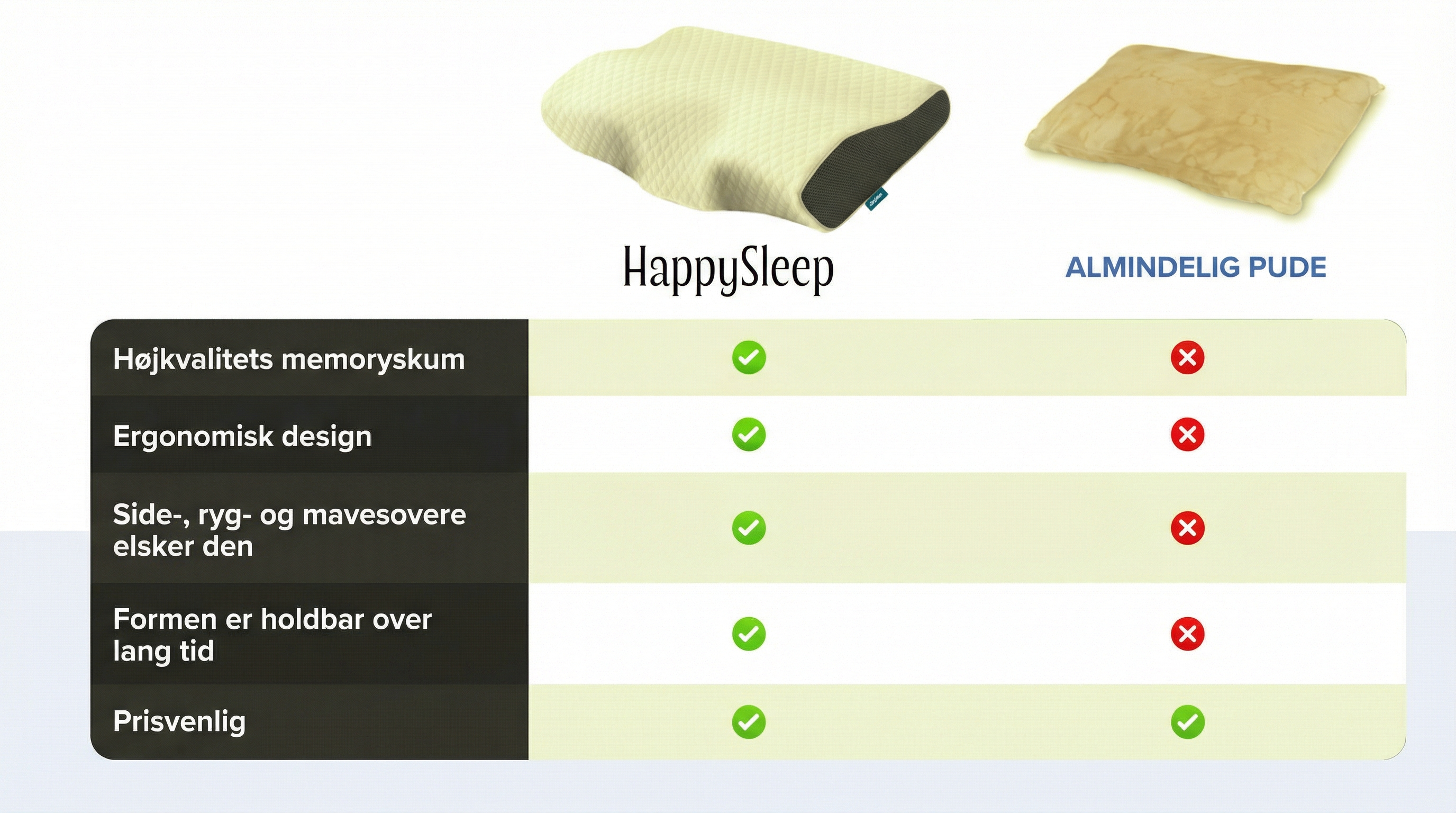 Bestil din HappySleep i dag og få den leveret direkte til din dør. Inden længe sover du som et barn og slipper for alle de gener, som din gamle pude har givet dig.