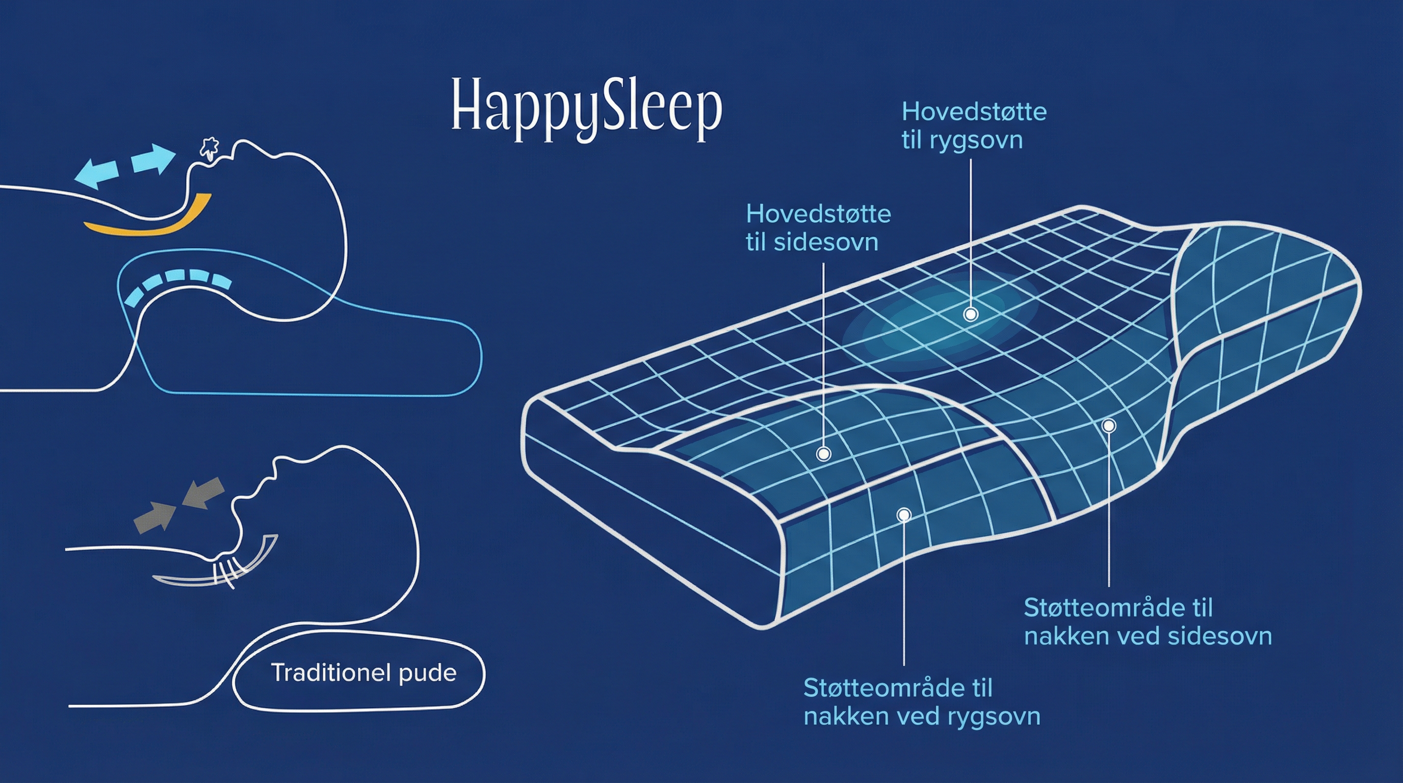 MEDICINSK ANSVARSFRASKRIVELSE: HappySleep puden markedsføres som en komfortpude, der kan bidrage til en bedre sovestilling, og den er ikke beregnet til at diagnosticere, behandle, helbrede eller forebygge nogen sygdom eller medicinsk tilstand. Snorken kan være et symptom på alvorlige søvnforstyrrelser som søvnapnø eller andre helbredsproblemer. Dette produkt er ikke et medicinsk hjælpemiddel og erstatter ikke professionel medicinsk rådgivning eller behandling. Hvis du lider af kroniske søvnproblemer, snorken, eller har mistanke om, at du har søvnapnø eller en anden søvnforstyrrelse, anbefaler vi, at du taler med en læge eller søvnspecialist. Kun en kvalificeret sundhedsprofessionel kan stille en diagnose og anbefale passende behandling af søvnrelaterede helbredstilstande. HappySleep bør ses som et supplement til god søvnhygiejne, ikke som en medicinsk løsning på helbredsproblemer.